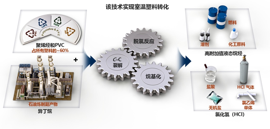 这项突破性技术实现了三大创新:一是反应条件革新,在常温下即可完成转化,能耗降低70%以上;二是工艺集成创新,将脱氯、裂解和烷基化三步反应整合为单一过程;三是资源协同利用,创造性地利用石化副产物作为反应介质,实现“以废治废”,实现废塑料资源的高效增值利用。